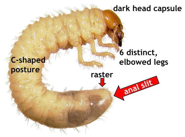 2.kép Pajor a jellegzetes morfológiai bélyegekkel: C-alakban görbült test, sötétebb színű fejtok, 3 pár ízelt láb, és a testvégen (az anális nyílás közelében) látható fajra jellemző sertesor elhelyezkedése. (Kép forrása: https://grubid.cals.cornell.edu/getting-started/)