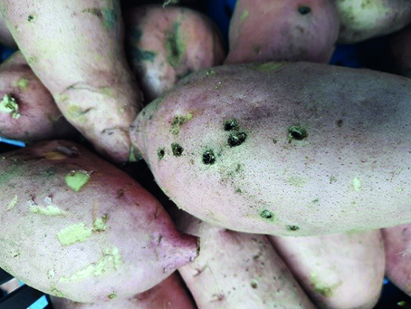 A drótférgek kisebb lyukakat, járatokat rághatnak a batáta gumójába.