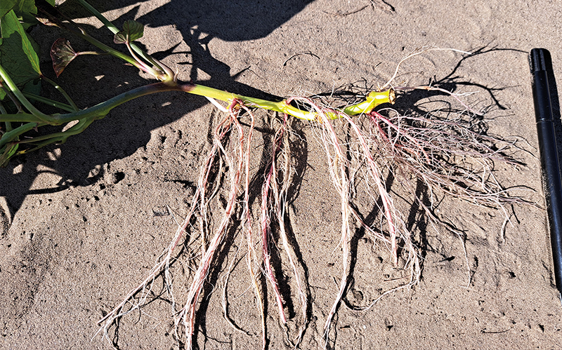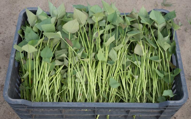 Kötegelt, szállításra kész batáta dugványok.