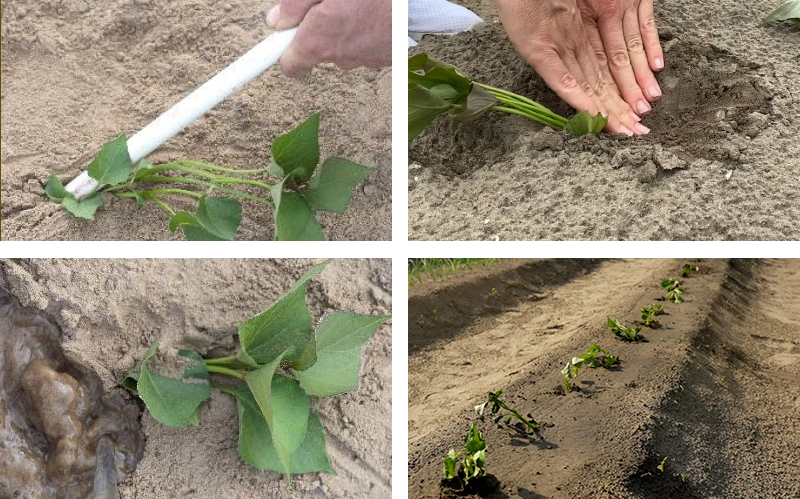 A kellően magas kötésszám érdekében javasoljuk a ferde, vagy fektetett ültetést, ami azt jelenti, hogy bár a növények akár kétharmad-háromnegyed része is a föld alá kerül, azonban csak sekélyen, néhány centiméter mélységbe, és a talajba helyezett rész közel vízszintesen helyezkedik el. Így biztosíthatjuk, hogy ne csupán elegendő szárcsomó kerüljön a talajba, melyeken megindulhat a járulékos gyökerek képződése, hanem hogy ezek fejlődése ne is zavarja egymást, így ceruzagyökerek (magasabb lignintartalmú, fásabb, a tárológyökerekhez hasonló színű, de azoknál vékonyabb gyökerek) kialakulása helyett értékes termést jelentő, megvastagodott tárológyökerek képződhessenek. A stabilitás biztosításának érdekében az ültetést követően a dugványok körül szükséges a talaj kíméletes, de határozott tömörítése.