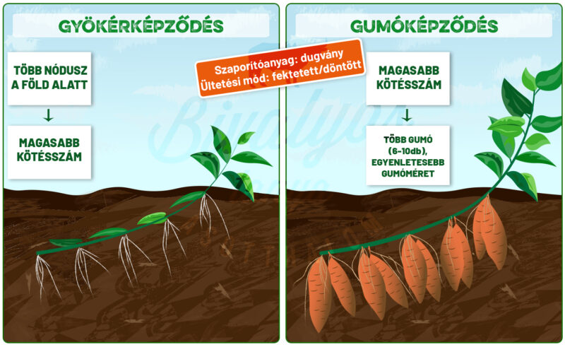 A növény föld feletti részei az ültetést követő első hetekben még igazán szembeötlő növekedést nem mutatnak, az indák „futása” ekkor még nem indul meg, a föld alatt viszont a gyökerek száma jelentős mértékben nő, és ideális esetben a második hétre már a gyökerek színesedése is megkezdődik. A kellő mennyiségű tárológyökér kezdemény létrejöttét követően, 30-40 nappal az ültetés után, az óvatosan lecsökkentett nedvességtartalom okozta enyhe szárazság ezeknek a tárológyökereknek a növelésére ösztönzi a növényt. A talaj alacsonyabb víztartalma miatt a déli nagy melegben ilyenkor a növények kicsit lankadhatnak, kókadozhatnak is.
