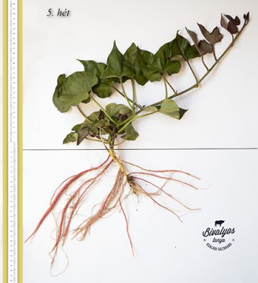 - 15-40. napig: fokozatosan (nem azonnal!) csökkentjük a vizet, körülbelül 30% nedvességtartalomig. Ez a vízmennyiség a növény számára kevés, a talaj túl száraz, a lombozat a hervadási pont közelében van, a déli nagy melegben a növény nyugodtan meg is lankadhat. A 30-40 nap közötti szárazabb környezet a növényt arra ösztönzi, hogy a tárológyökereit fejlessze, azaz a terméshozamra nagyon előnyös. Ezen időszak végén, kb. az 5-6. héten már láthatóak a tárológyökerek vastagodásai.