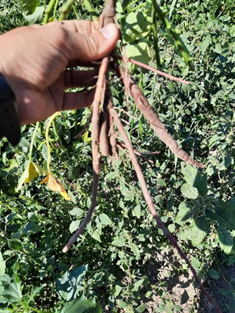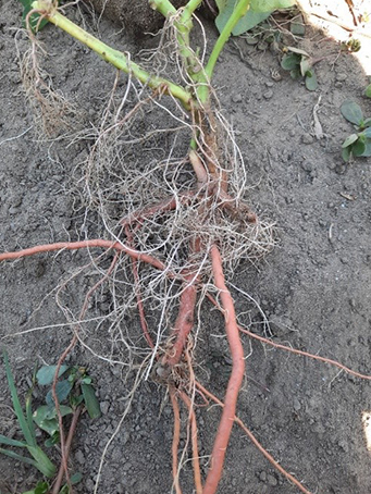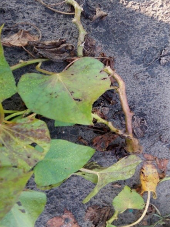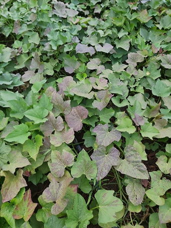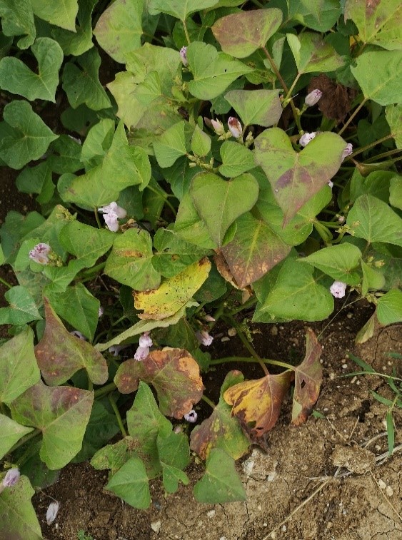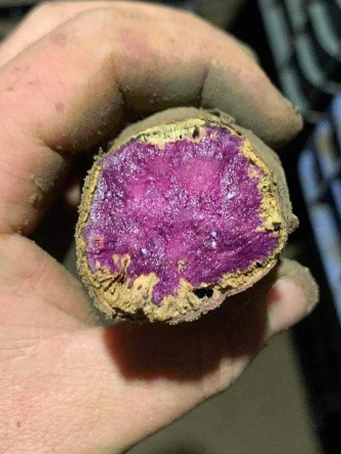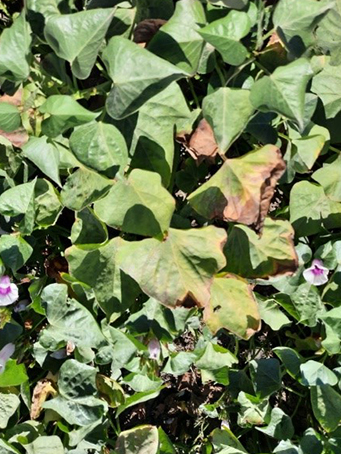 Az ültetés utáni 80. napon észlelünk lilás, nekrotikus tüneteket a lombozaton. Nem kell megijedni nem tápanyag hiányról van szó, hanem ilyenkor kezdi vissza szívni a tápanyagot a gumó a lombozatból. Vannak olyan édesburgonya fajták is, amelyeknél a lilás szín egy fajtabélyeg, de ezeket a lilás elszíneződéseket már a fenológiai fázis elején észleljük.