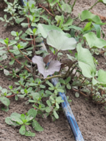 Az édesburgonyának nincs specifikus gyomnövénye. Nagyon változatos a gyomflórája, amely legfőképpen függ a talajtípustól. A gyomirtás az ültetés során csak az első négy-hat hétben szükséges, mivel később a legtöbb édesburgonya-növény teljesen és hatékonyan fedi le a gyomokat. A hatékony gyomirtás a sikeres édesburgonya termesztés egyik kritikus szempontja, mivel a gyomok versenyeznek a tápanyagokért, a vízért és a napfényért. A gyomok rontják a terméshozamot és minőséget. A gyakori vetésforgó előnyös a gyomnövények csökkentésében, mivel alternatív gyomirtó szerek alkalmazása csökkenti a gyommagtermelést és a későbbi felszaporodásukat. A mechanikai gyomirtást (kapálást, rotátorozást) a gyomnövények korai fejlődési szakaszában kell elvégezni, majd később az édesburgonya indái úgy benövik a talajfelszínt, hogy elnyomják a gyomokat.