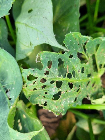 Tünetek: A termesztés során sok lepkefaj hernyója károsíthatja a lombozatot. A leveleken található lyukak hernyó jelenlétére utalnak. Van olyan faj, mely ezüstös szállal szövi be a leveleket vagy hernyófészket is készíthetnek. A hernyók jelenlétére utal az utánuk hátrahagyott ürülék is.